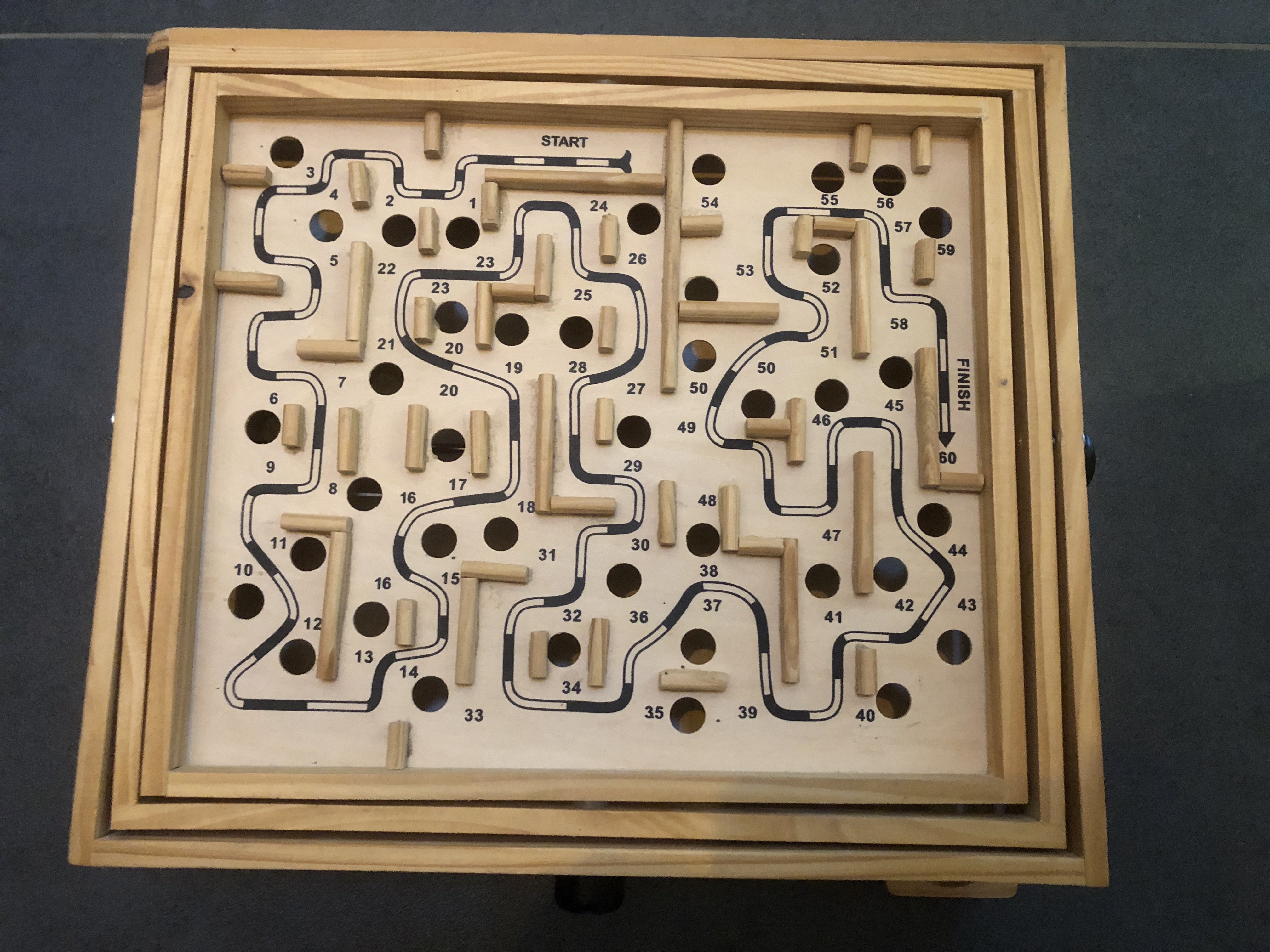 Leid een kleine knikker van de ‘start’ naar de ‘finish’ door het bord (32 x 28 cm) te kantelen met de twee knoppen aan de zijkant.